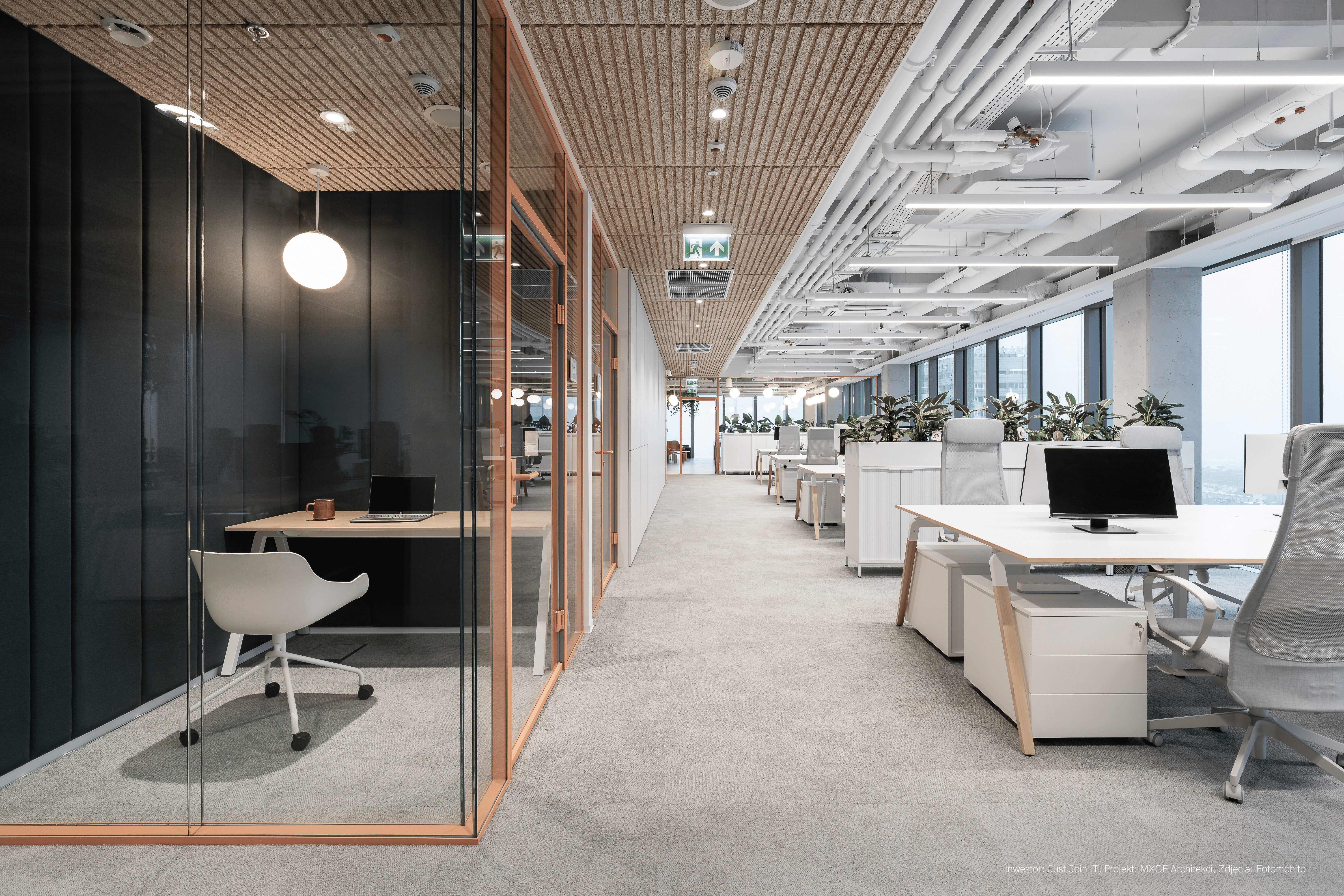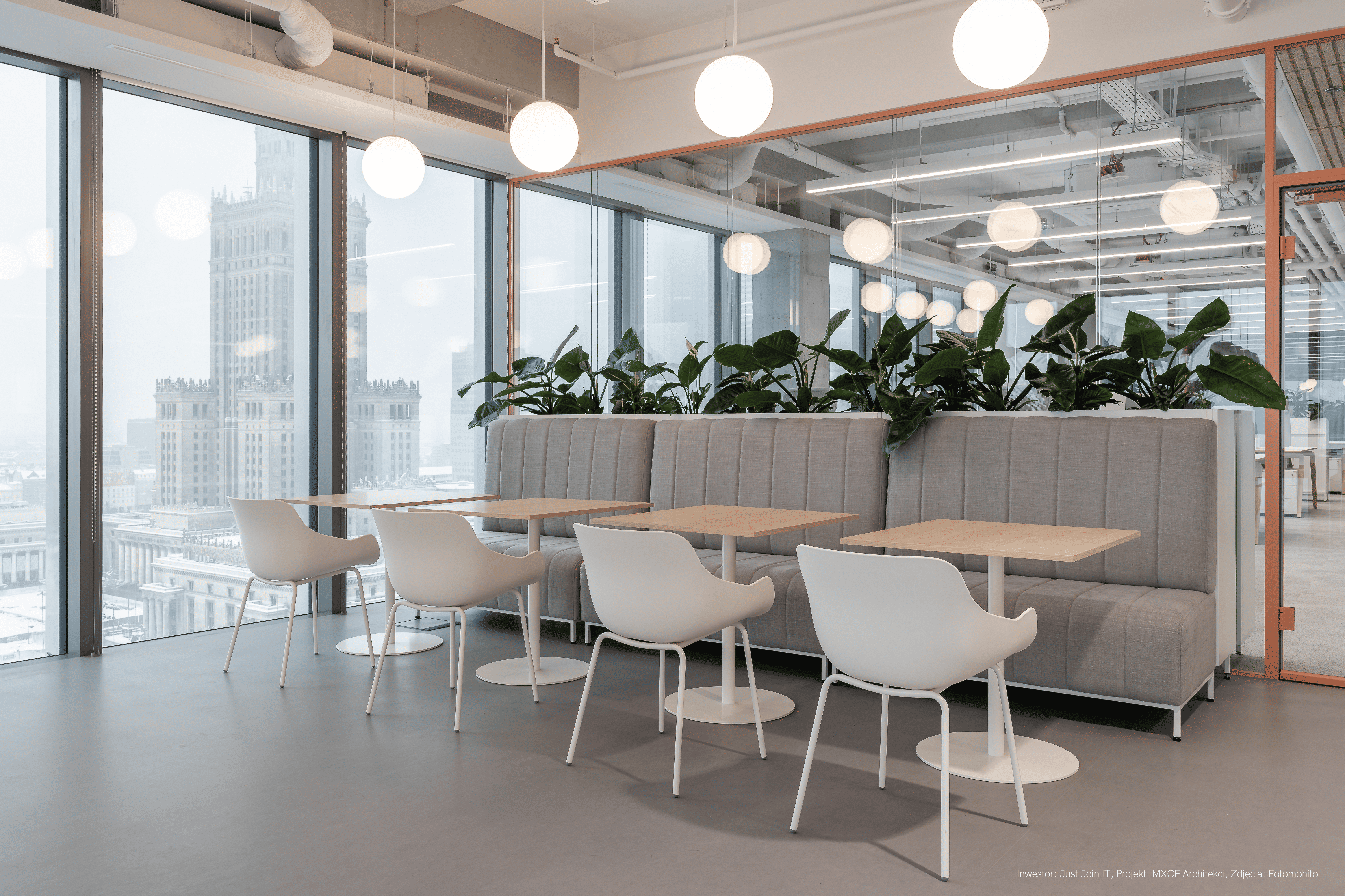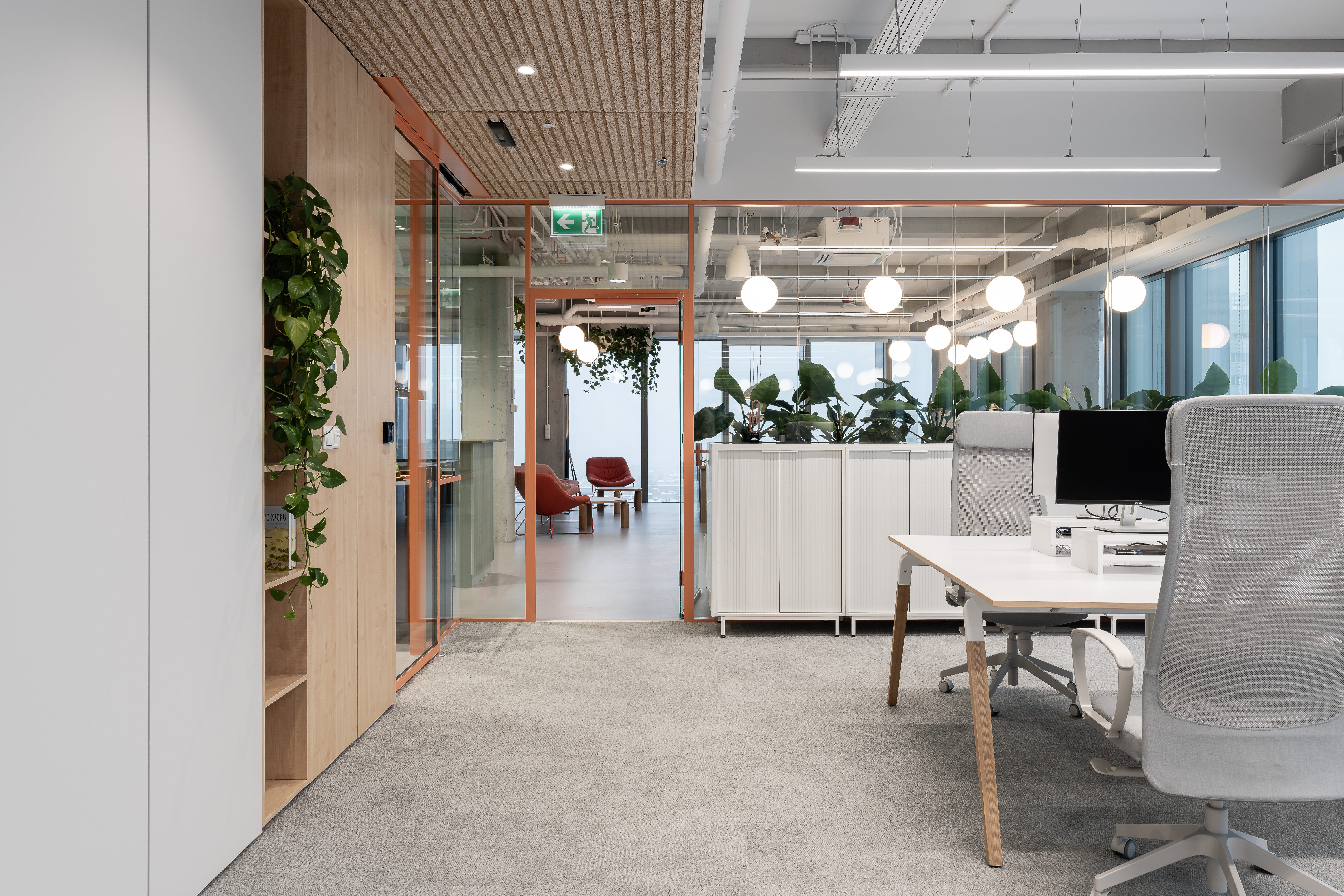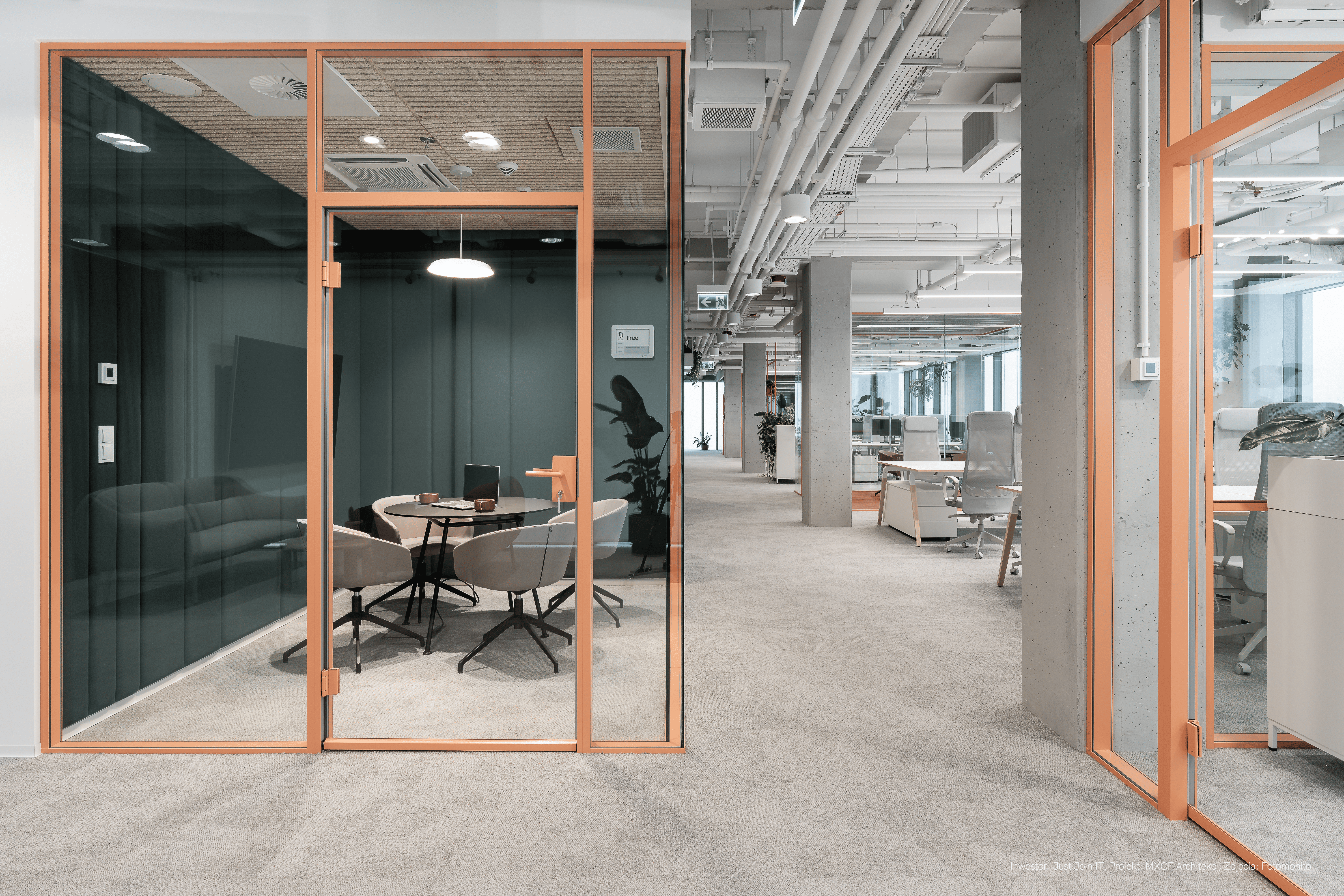 Natürliches Licht, prächtige Pflanzen und außergewöhnliche Farben dominieren im Inneren des Warschauer Büros von Just Join IT. Die Architekten des MXCF Architekci-Studios entschieden sich für unsere Wände und Türen aus Aluminium und Glas in der Farbe „Peach Fuzz“ – der Pantone-Farbe des Jahres 2024 – die die Besprechungsräume und Fokusräume für ruhiges Arbeiten voneinander trennen. Die transparenten Trennwände fördern die Offenheit und gewährleisten gleichzeitig einen hohen akustischen Komfort.