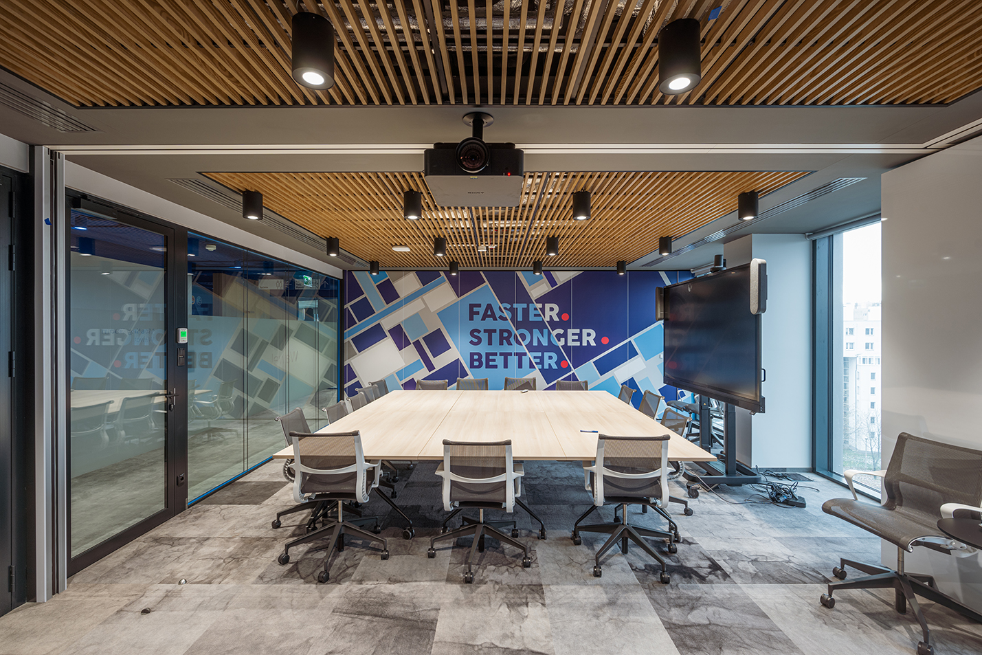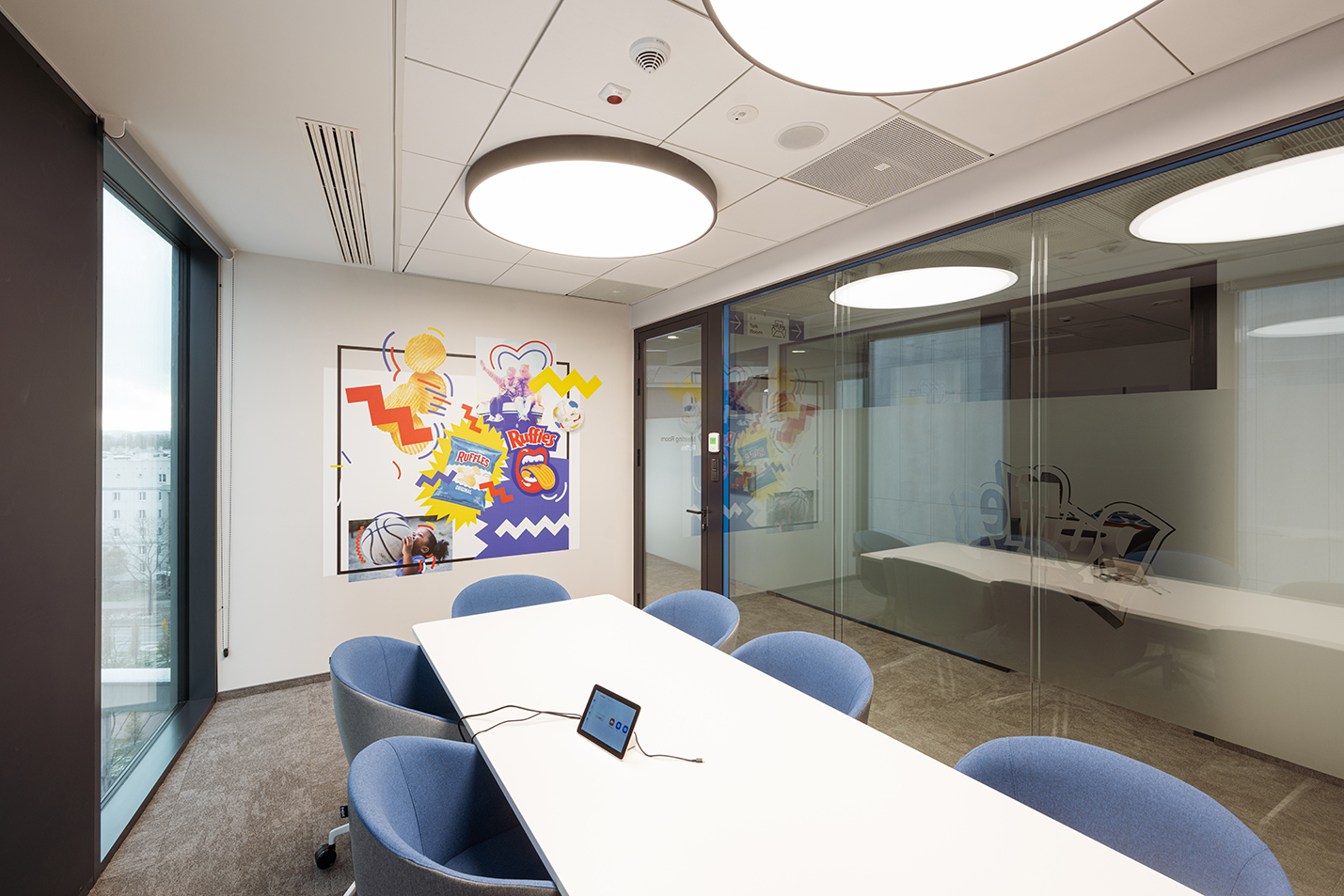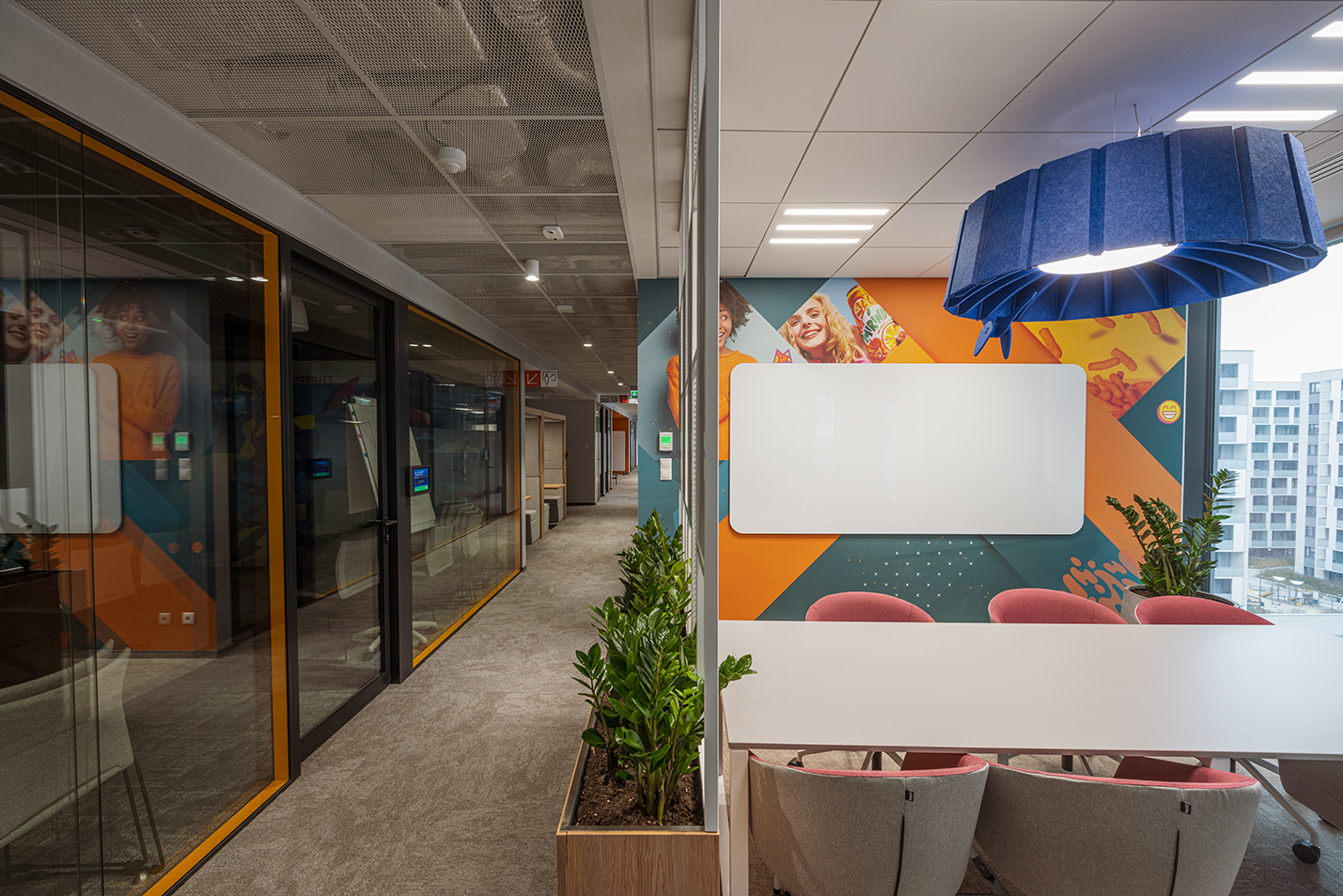 In Räumen, die mehr Schutz benötigen, haben wir feuerfeste Verglasungen eingebaut, die Sicherheit garantieren, ohne auf moderne Ästhetik zu verzichten. Durch diese Kombination aus Funktionalität und unverwechselbarem Stil wird das Büro von PepsiCo zu einem Ort voller Energie, der Teamarbeit und Kreativität fördert.