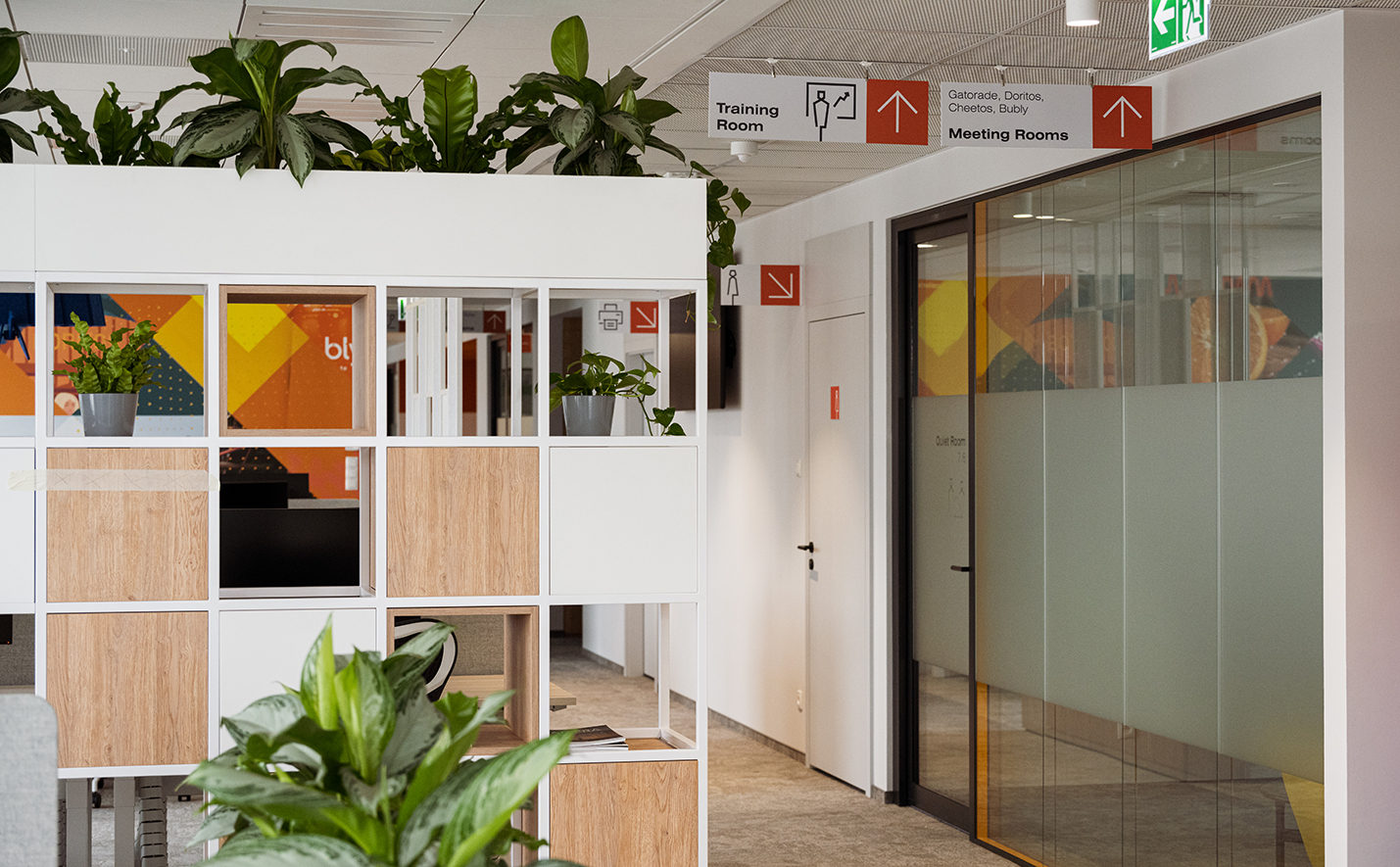 Dank unserer Glaswände und Innentüren öffnen sich die Innenräume dieses Büros und lassen kräftige Wandfarben und ungewöhnliche Accessoires sichtbar werden.