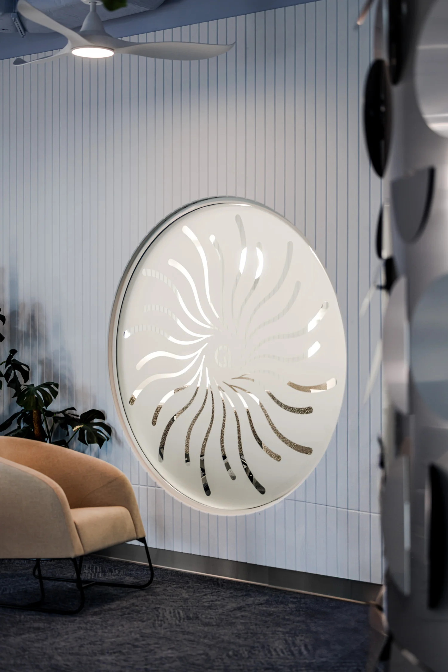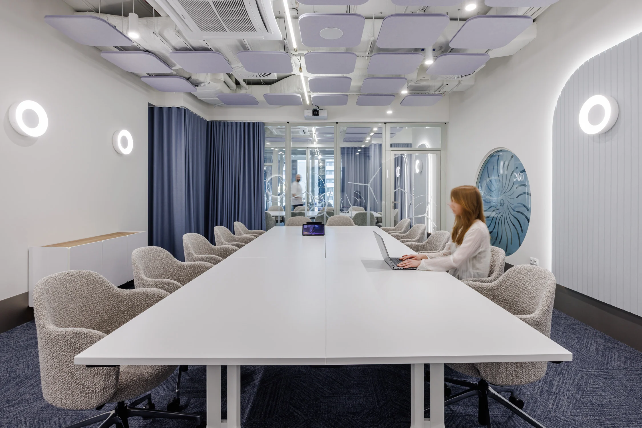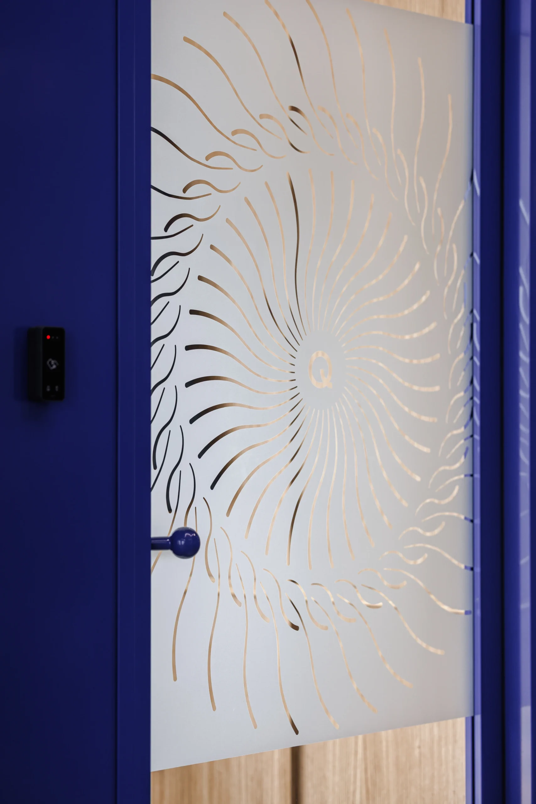 In diesem Projekt kamen ULTRA SILENCE Wände sowie die feuerbeständigen ULTRA SILENCE FS zum Einsatz, ebenso wie mobile Trennwände und STANDARD-Innentüren. Ein besonderes verglastes Element ist die dekorative Rosette, die wir auf Sonderbestellung angefertigt haben. Und das ist noch nicht alles – die Profile der Glaswände wurden passend zur visuellen Identität von Qair Polska lackiert.