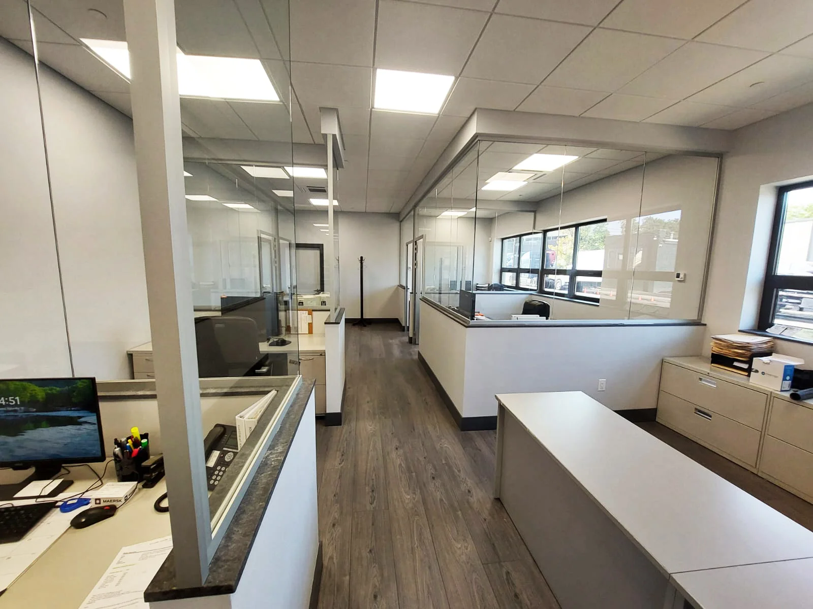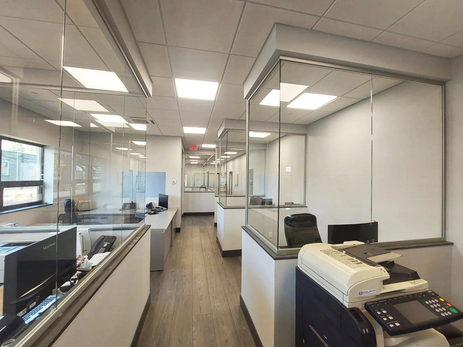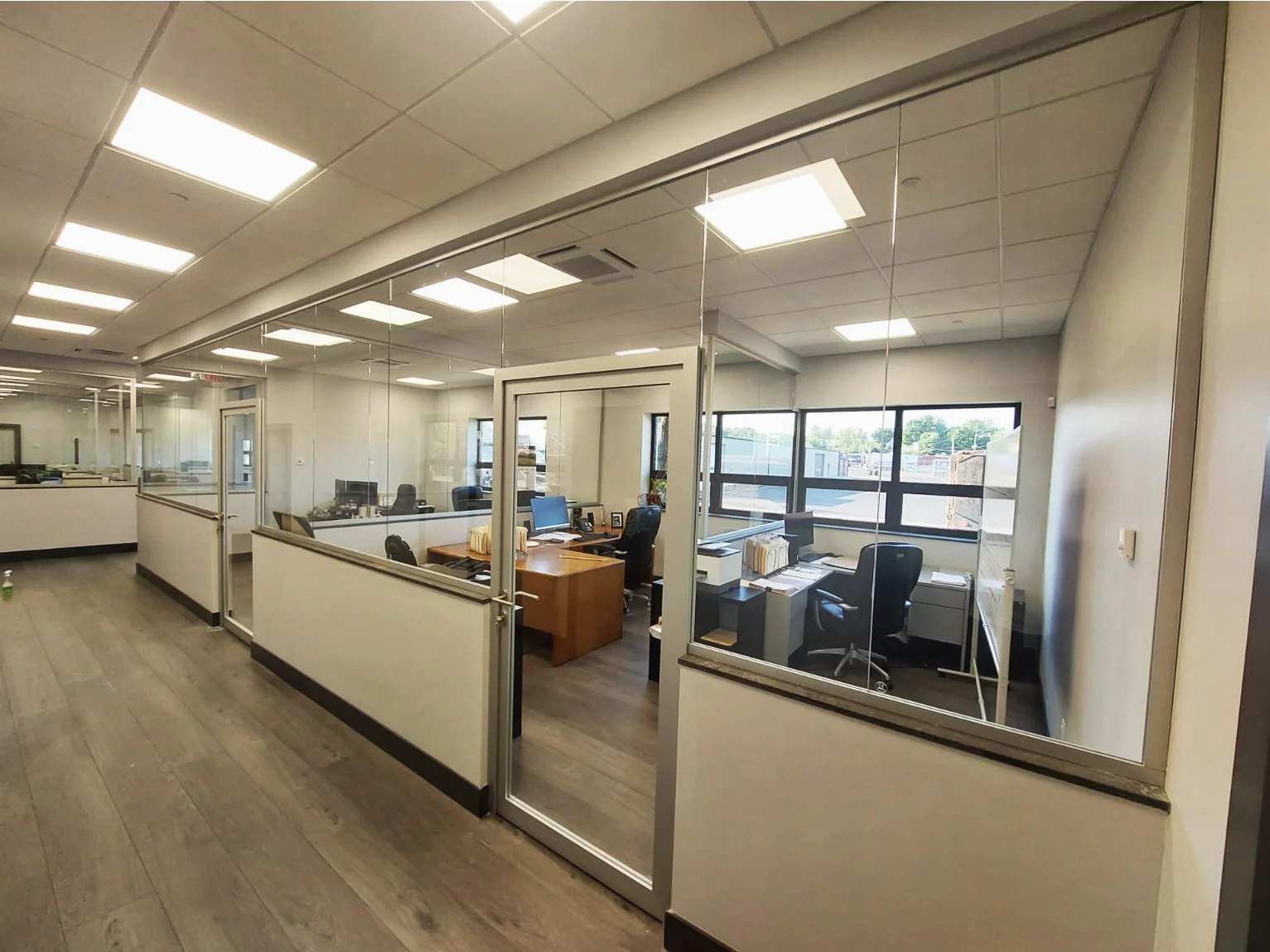 Lieferung und Montage von einflügeligen Glaswänden des Typs PURE sowie Türen mit silber eloxierten Profilen.